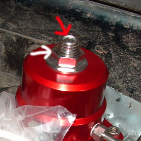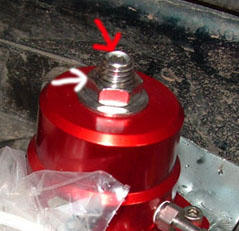 With fuel flowing through the system at full capacity, check for leaks at all connections. To set the pressure on the regulator, loosen the top nut (white arrow) and insert an allen key into the adjustment stud (red arrow). Turn it either way to set the pressure.