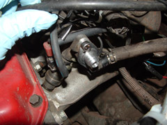 Stock FPR setup. The return line runs off to the right side, and the vacuum hose (blue disconnected lines) goes up to my thumb back to the intake manifold.