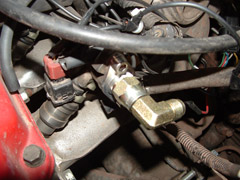 Install a female to male 90*. Its nice if they have a swivel end on one side like the one pictured. Now everyone I've talked to about flare fittings says you don't have to use teflon tape on the threads. Flare fittings seal on the cone not the thread. I use tape anyways, since its cheap and can't hurt. Make sure it's made for gasoline.