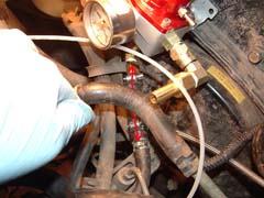 Now you have to set the base and idle pressure on the regulator. The system must be pressurized by turning the fuel pump on, but not the motor. OR you can turn on the motor and pull the vacuum line off the regulator. Rather than using the fuel pump check terminal, I crossed the main power wires at the relay to pressurize the system without turning on the motor.
