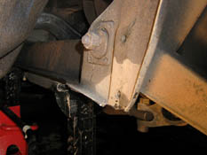 Now to install the brackets, bushings and sway bar. Because I'm using an oversized bar, my problem is obvious. Stock brackets fit with no problem, but the 18mm bushings extend the bracket over the edge of the crossmember. Solution is to cut the lip off the crossmember.
