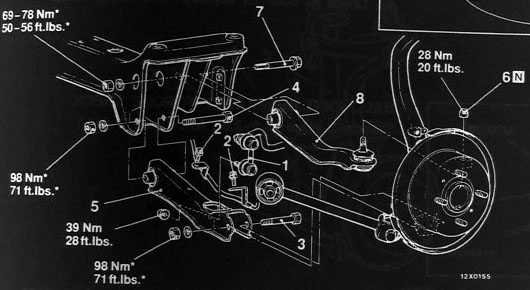 First, replace the front arms on both sides. You will need to remove the bolts at the crossmember and hub (bolts #3 and #4 pictured above), both are 17mm with 17mm nuts. Don't lose the washers.