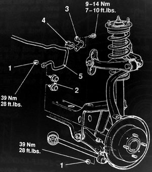 The sway bar (#5) is connected to endlinks (#2), which are then bolted to the lower front arm. As the arm rises, it pushes up on the endlinks which push up on the sway bar. It rotates slightly and pulls the other side's front arm up, to try to equalize the wheels' height and thus, eliminate body roll. Some sway bars flex under the torsional strains that they undergo, and upgrading to a thicker one is a common modification. The thicker the sway bar, the more flat the car will be through turns. .